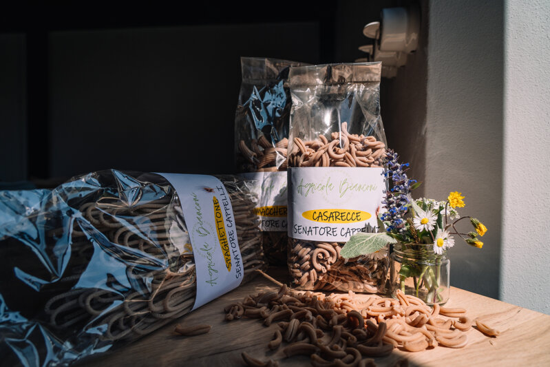 La pasta secca è un alimento fondamentale nella cucina italiana e quando si parla di qualità, il Senatore Cappelli è uno dei grani più pregiati utilizzati. Questo grano duro, grazie alle sue caratteristiche uniche, è noto per il suo basso indice glicemico, rendendolo una scelta ideale per chi cerca di mantenere un'alimentazione sana. Le nostre paste sono prodotte utilizzando esclusivamente grano coltivato in azienda che viene, poi, macinato nel nostro Mulino con macine in pietra. La trafilatura in bronzo conferisce alla pasta una superficie ruvida, ideale per trattenere i condimenti, mentre la lenta essiccazione a bassa temperatura consente di mantenere intatti i sapori e le proprietà organolettiche. Se stai cercando una pasta di alta qualità che aggiunga sapore e nutrizione ai tuoi piatti, non cercare oltre. Sia che tu sia un appassionato di cucina o semplicemente alla ricerca di un'alimentazione sana, questa pasta rappresenta un'opzione deliziosa e nutriente. Packaging completamente ecosostenibile, plastic free e compostabile.
